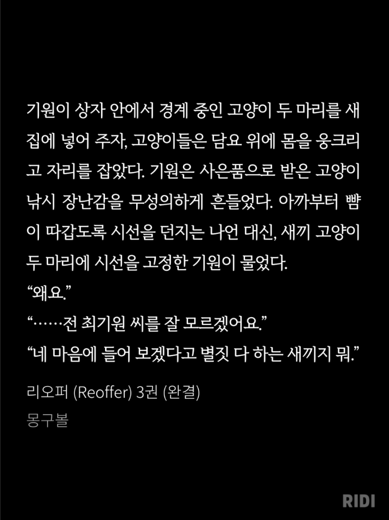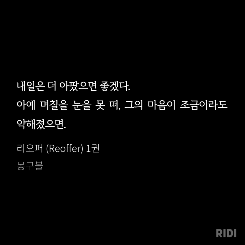 피폐물에서 이런 서정적인 문체라니! 진짜 미쳤. 형광질을 엄청 했음!! 너무 감정 표현을 잘 해주셨고 미사어구가 너무 땋 들어맞아서 애잔하고 애틋하고 뭐 여튼 걍 짱이었음!!